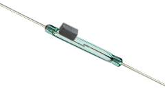 干簧開關由含鐵鎳的兩塊鐵磁簧片構成,并密封于玻璃體中。